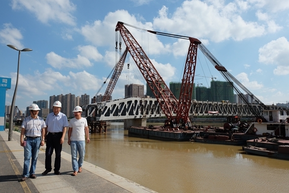 同一時間,瀏陽河人行景觀橋項目部已經(jīng)完成了最后一艘浮吊平臺的錨固工作。最初臨時橋墩施工方案為每組8根鋼管樁,監(jiān)理部審核認為該方案未考慮最不利的極端天氣下洪峰的影響,嚴令改正。最終方案改為14根鋼管樁并予以實施。正是監(jiān)理人富于遠見的及時調(diào)整,在兩日后瀏陽河水位達40.00米的洪峰里,建設中的大橋巍然屹立,風雨不動!