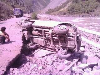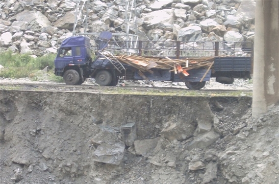 彭云:有天中午,我們從夾壁鄉(xiāng)衛(wèi)生院巡查完趕去另一個(gè)工地,兩個(gè)工地之間有一段未完工的317國道路基。受地震影響,道路遭受嚴(yán)重的破壞,兩邊山上時(shí)有滾石掉下。車在顛簸、搖晃中緩慢行駛,過了畢棚溝路口的小橋后是一個(gè)急轉(zhuǎn)彎。突然,前面從山上滾下一根木頭橫在車前,司機(jī)劉定峰大喊一聲“壞了!”,瞬間車子跳起來,劇烈搖晃,我下意識(shí)抱住了頭,身體在車內(nèi)左右撞擊,周圍的東西在搖晃,車在旋轉(zhuǎn),十幾秒鐘以后,一切戛然停止。我們又怔了十幾秒,“大家沒事吧?”我們異口同聲問道,我試著動(dòng)了動(dòng)四肢,沒受傷,其他人也都沒有受傷。在附近目睹這驚險(xiǎn)場面的工友們?nèi)颗苓^來拉我們出去。從車子里出來后,我們發(fā)現(xiàn)側(cè)翻車輛離河邊只有兩米!也要感謝劉定峰,在車摔到坑里前他死死的抓住方向盤,踩著剎車,避免了更大的險(xiǎn)情發(fā)生。