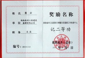 2011年,湖南省政府授予長順項(xiàng)目管理有限公司湖南省對(duì)口支援四川理縣援建先進(jìn)單位的光榮稱號(hào)。由長順公司承監(jiān)三湘大道、商貿(mào)中心等項(xiàng)目獲四川天府杯金獎(jiǎng),理縣中學(xué)項(xiàng)目獲四川天府杯銀獎(jiǎng)。講述者彭云榮獲湖南省政府頒發(fā)的二等功勛章和獎(jiǎng)狀,并獲邀參加湖南省委省政府領(lǐng)導(dǎo)接見表彰。
