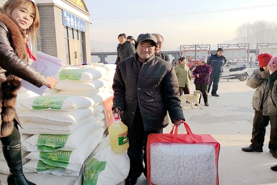 24日清晨,在副旗長(zhǎng)遲亞玲等旗有關(guān)負(fù)責(zé)同志陪同下,慰問(wèn)組赴王爺府鎮(zhèn)希莊村,代表中輕集團(tuán)向希莊村捐贈(zèng)產(chǎn)業(yè)扶貧資金22萬(wàn)元,并為70歲以上老人送上米、面、油和保暖棉被等物資。王珂靈在寒冬中發(fā)表熱情洋溢的講話,傳遞中輕集團(tuán)黨委的深情厚誼,溫暖了貧困群眾的心田。