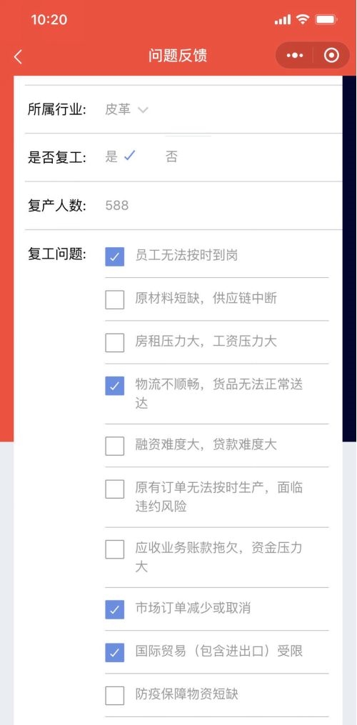 企業(yè)可以一鍵反饋復(fù)工時(shí)遇到的問題,問題覆蓋員工到崗、融資問題、供應(yīng)鏈問題、物流問題等10個(gè)方面。