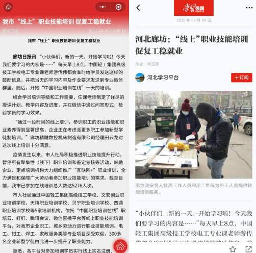 △“學(xué)習(xí)強(qiáng)國(guó)”河北學(xué)習(xí)平臺(tái)和《廊坊日?qǐng)?bào)》分別對(duì)中國(guó)輕工集團(tuán)高級(jí)技工學(xué)校 “開展企業(yè)新型學(xué)徒制線上教學(xué),助力復(fù)工復(fù)產(chǎn)、穩(wěn)就業(yè)”的情況進(jìn)行了相關(guān)報(bào)道