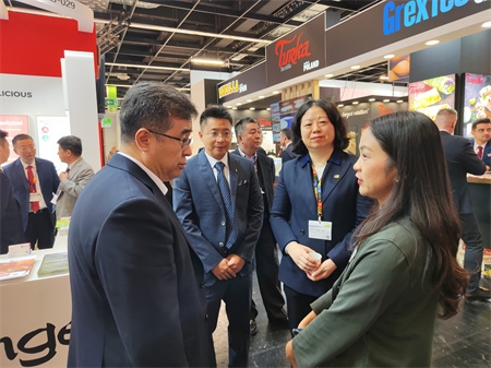 展臺(tái)首日即吸引了來自歐亞等產(chǎn)業(yè)鏈上下游參展企業(yè)和觀眾的持續(xù)關(guān)注。保利集團(tuán)總經(jīng)理助理,保利中輕黨委書記、董事長(zhǎng)安勝杰來到中國(guó)食品發(fā)酵工業(yè)研究院展臺(tái),親切慰問參展員工,并前往安琪酵母、加拿大Saputo乳業(yè)公司、法國(guó)SILL SAS集團(tuán)、荷蘭Salud Foodgroup Europe BV等相關(guān)展臺(tái)進(jìn)行交流,與世界食品博覽會(huì)(Anuga)主辦方就未來有關(guān)合作進(jìn)行交流,并接受主辦方專題采訪。