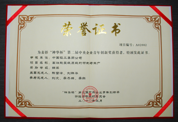 3月30日,“神華杯”第二屆中央企業(yè)青年創(chuàng)新獎(jiǎng)表彰大會(huì)在京舉行,國資委主任李榮融發(fā)表重要講話。中國輕工集團(tuán)公司“高性能壁紙?jiān)埖难兄婆c生產(chǎn)”項(xiàng)目榮獲“神華杯”第二屆中央企業(yè)青年創(chuàng)新獎(jiǎng)銅獎(jiǎng),該項(xiàng)目由中國制漿造紙研究院研究開發(fā)部特種紙技術(shù)研發(fā)中心完成。