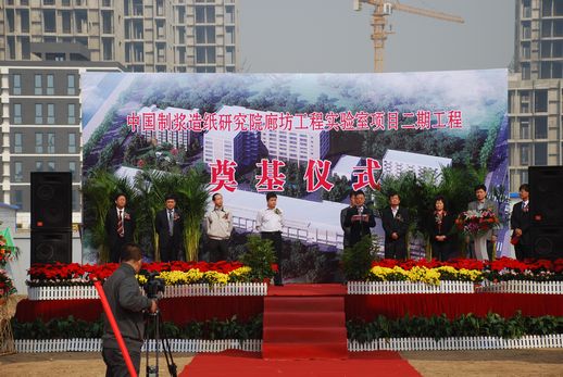 2012年10月12日,俞海星總經(jīng)理出席了中國制漿造紙研究院廊坊工程實驗室項目二期工程開工奠基儀式。俞總在致辭中對造紙院廊坊項目建設(shè)工作給予了充分肯定,對長期以來關(guān)心和支持中輕集團發(fā)展,特別是關(guān)心和支持該項目籌備實施的廊坊市各級領(lǐng)導(dǎo)和部門表示了感謝,并向為工程開工付出辛勤勞動的一線干部職工表示了慰問。他希望項目承建單位要切實增強緊迫感和責(zé)任感,嚴格工程管理,確保安全、質(zhì)量和進度,力爭把項目建設(shè)成為廊坊科技谷的標志性、樣板性工程。中國制漿造紙研究院院長曹春昱和廊坊科技谷有關(guān)領(lǐng)導(dǎo)也分別在儀式上致辭。